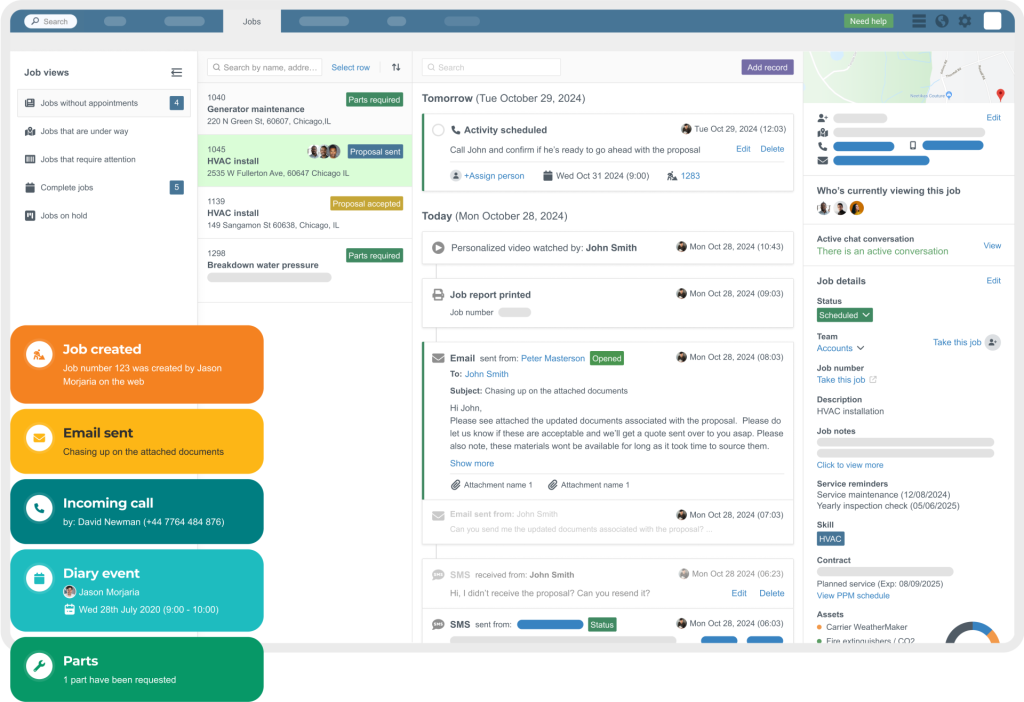 From the singular job view, you can access a chronological communication timeline and job details, including work addresses and contact details, contracts and SLAs, job notes, and more.