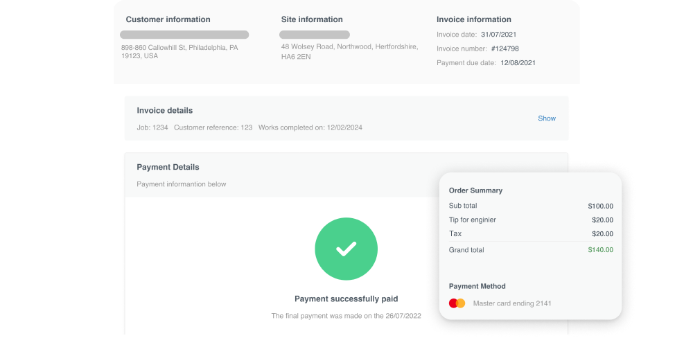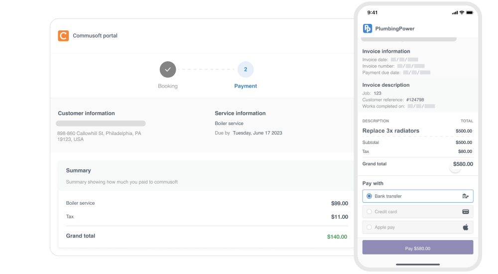 Send customers a secure payment link so they can pay when it’s most convenient for them. Here they can review their invoice, and pay via credit card, bank transfer, or Apple/Google Pay. With this process, Commusoft makes it easy for customers to pay initial deposits, partial or final invoices, as well as multi-invoice payments through a variety of specialized online portals.